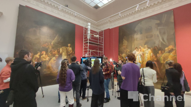 На экспертном совете специалисты и представители СМИ впервые увидели обновлённую картину размером 510 на 393 см, написанную по поручению императора Павла I для интерьеров Михайловского замка не позднее 1800 года.
