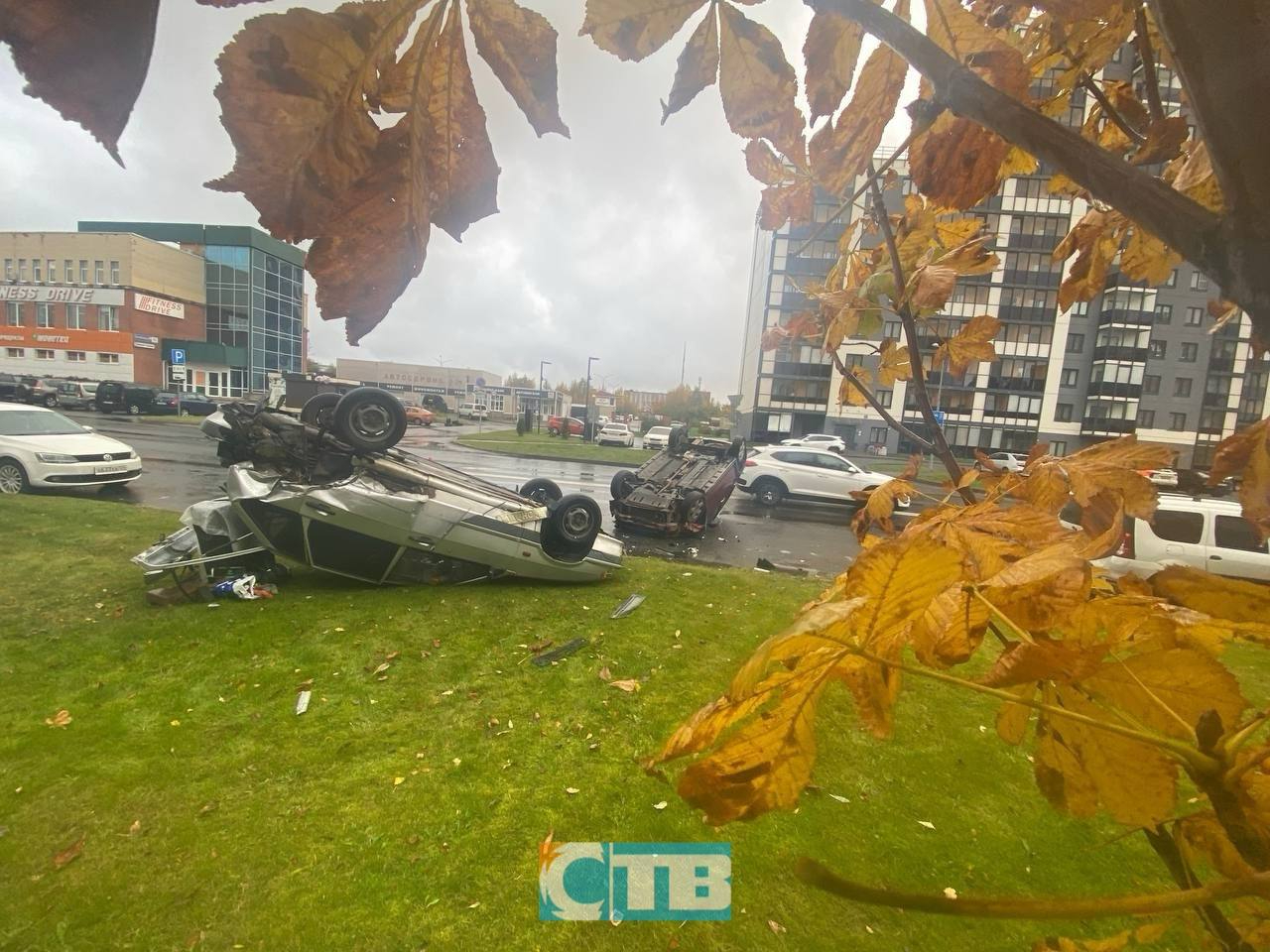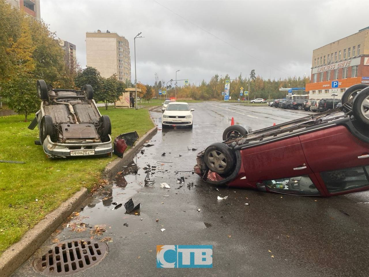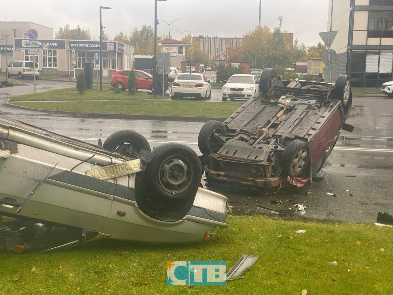 Фото с места ДТП публикует "Телекомпания СТВ. Сосновый Бор". На видео две перевернувшиеся машины запечатлел очевидец Алексей Бугаенко. Запись публикует канал Мой Сосновый Бор @msb_news в Telegram.