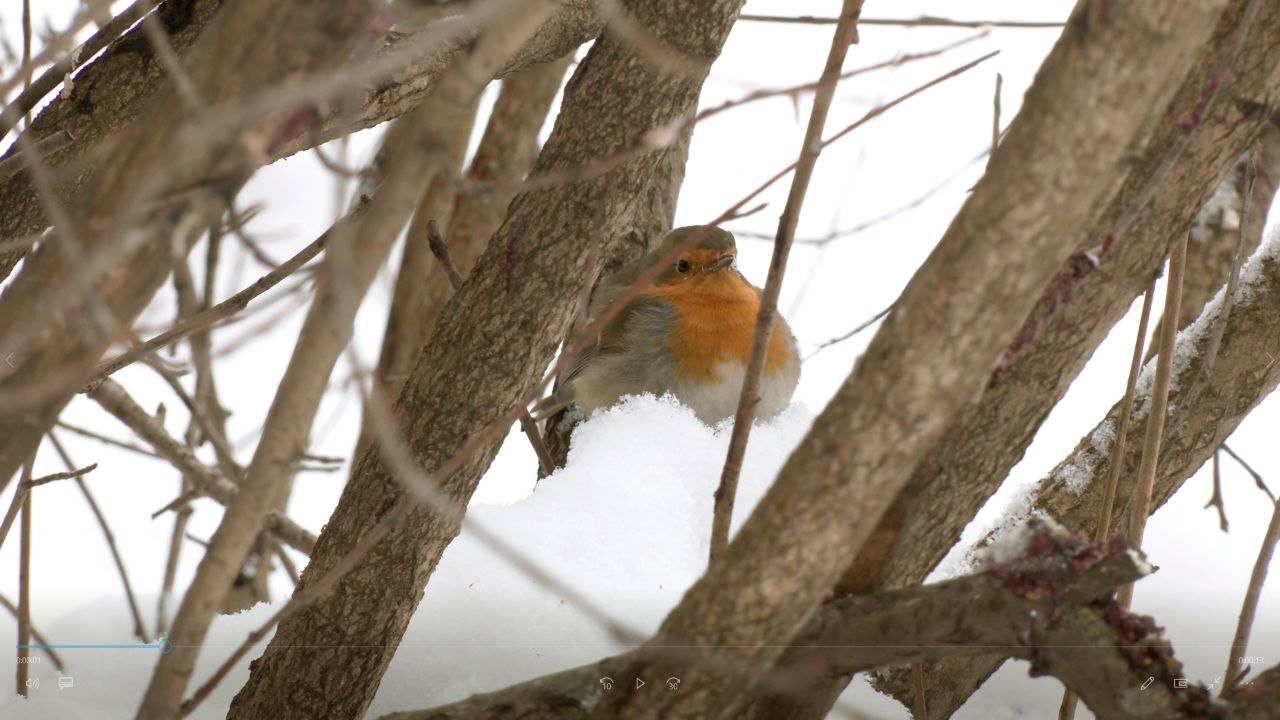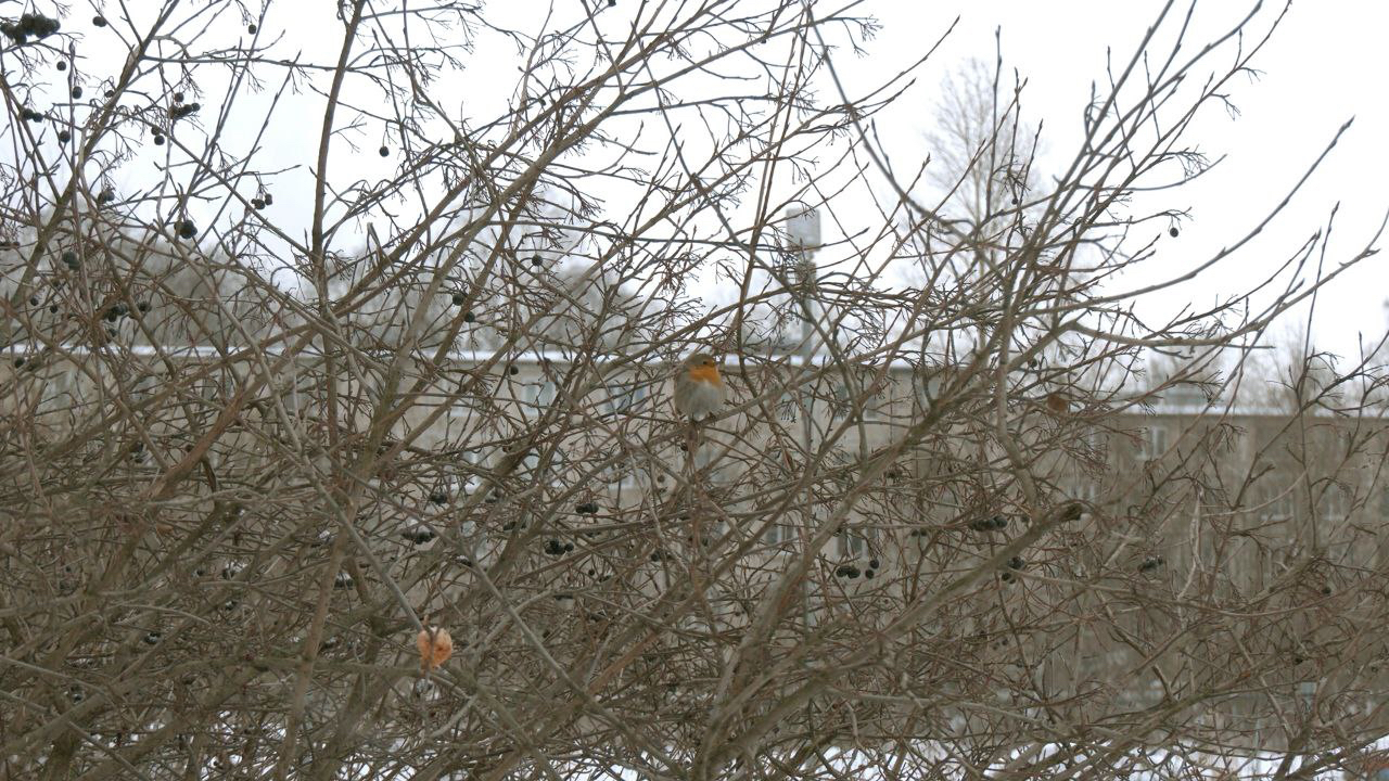 В усадьбе Сосновка, предположительно, осталась на зимовку именно «невеста». Зарянка переодически появляется возле жилого квартала рядом с усадьбой Сосновка и смело позирует на камеру.