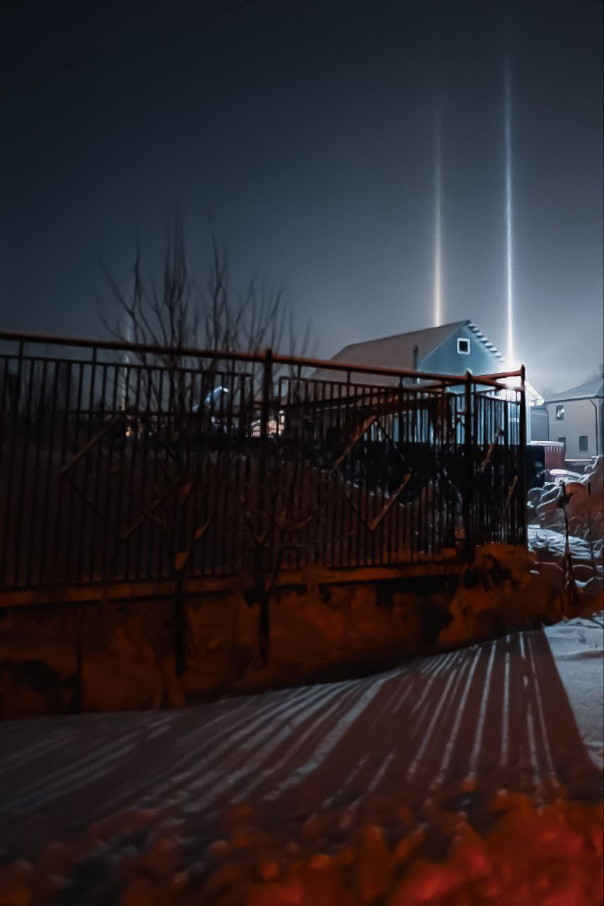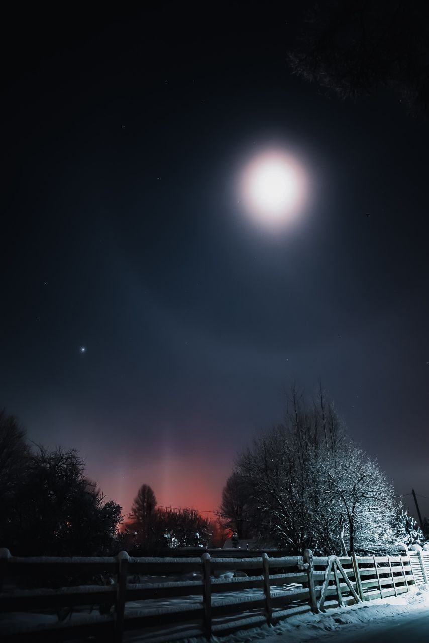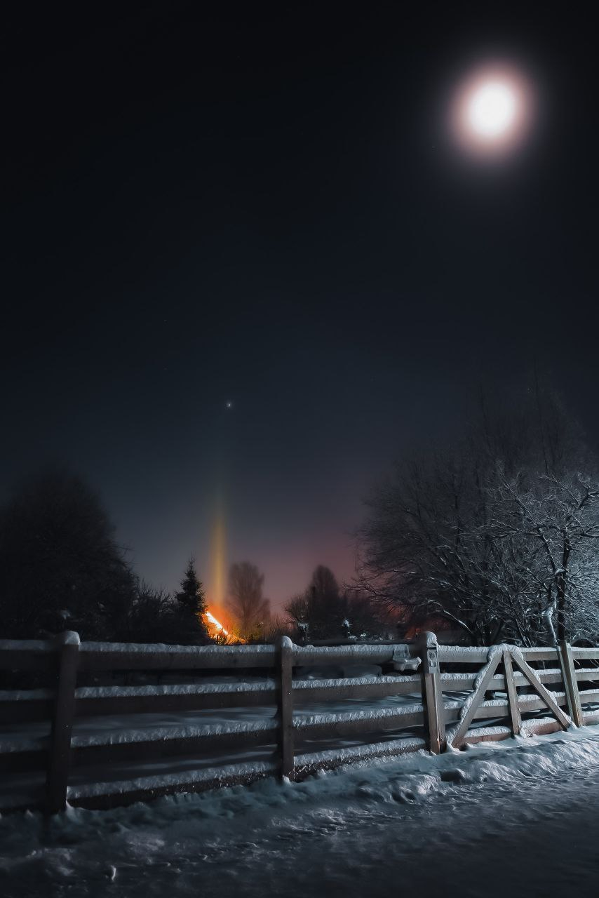 К вечеру, как и обещали прогнозы, похолодало. Из-за этого удалось полюбоваться на еще одно оптическое явление - световые столбы. Бонусом на небе образовалось лунное гало.