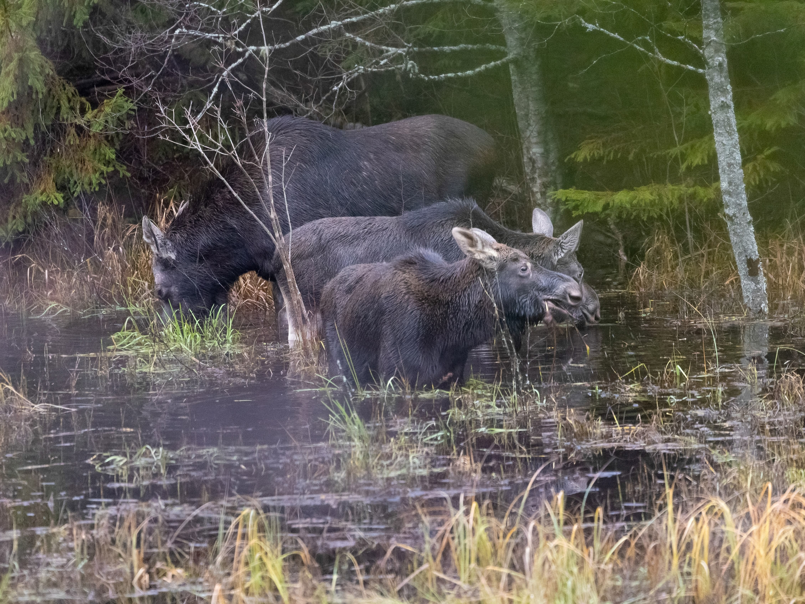 В Ленобласти неспешная лосиная семья приступила к водной трапезе