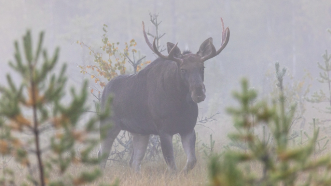 В Нижне-Свирском государственном заповеднике лесной гигант вышел на променад. Возможно, он блуждал меж деревьев, укрытых туманом, в поисках дамы сердца или же подходящего соперника. Или, быть может, наоборот, возвращался после схватки или же свидания.