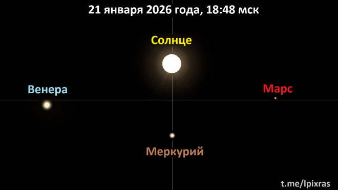 В среду, 21 января, в 18:48 по московскому времени ожидается кульминация парада планет, который формировался вокруг Солнца последние несколько месяцев. На небе Меркурий сблизится с Солнцем на расстоянии примерно 2 градусов, а Марс и Венера образуют горизонтальную ось крестообразного соединения — Венера слева, Марс справа, оба на расстоянии около 3 градусов от Солнца.