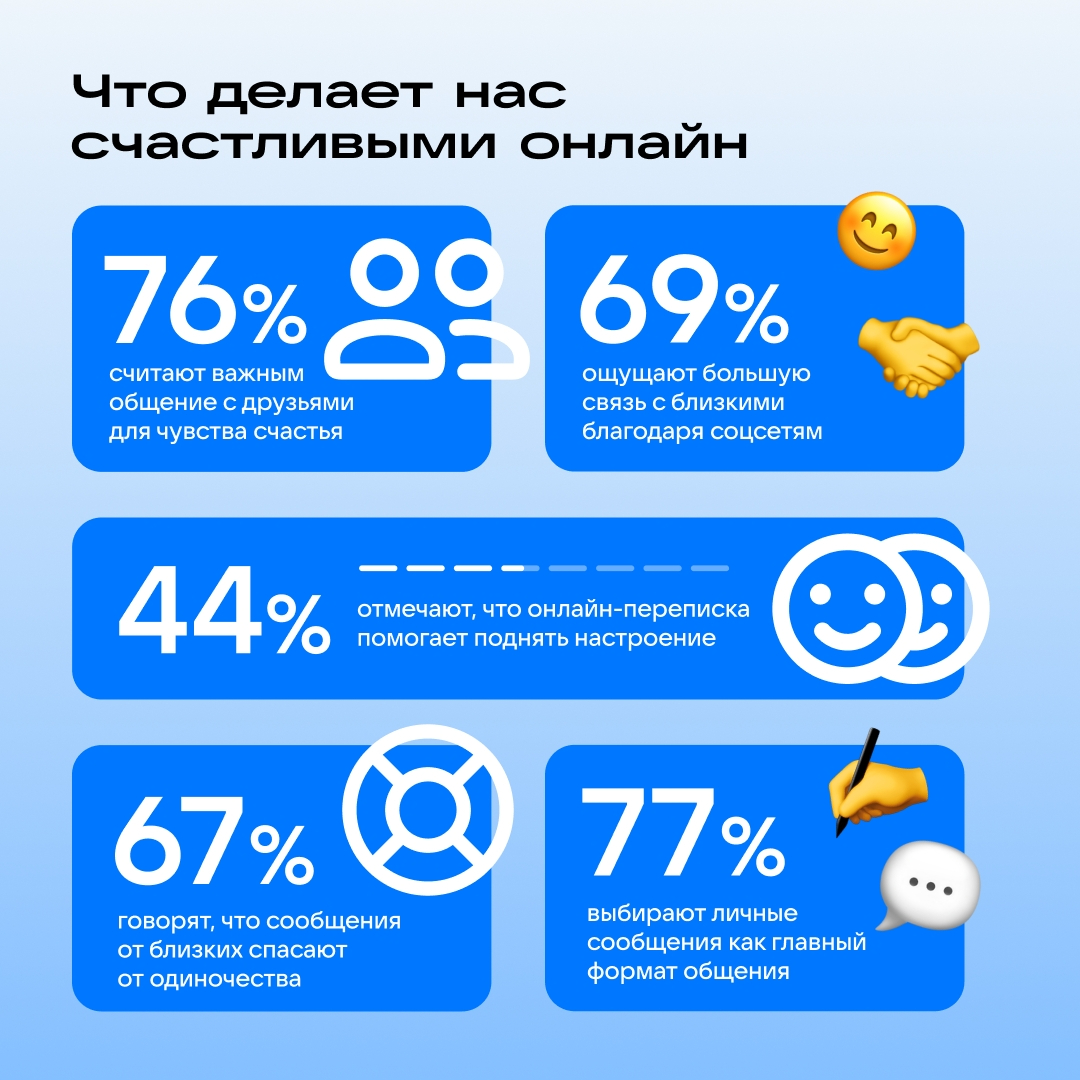 По итогам опроса 76% участников назвали общение с друзьями и знакомыми важной составляющей счастья — этот показатель одинаков для разных возрастов и полов. Онлайн-контактами с близкими довольны 75% респондентов, при этом женщины отмечают это чаще мужчин (79% против 69%). Для 69% пользователей социальные сети усиливают ощущение связи с окружающими, и здесь также лидируют женщины — 71% против 65%.