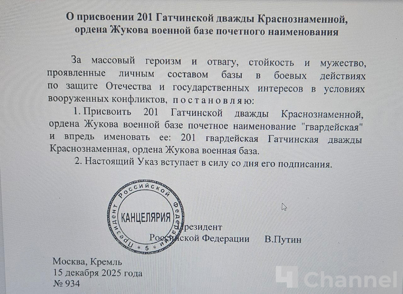 201-й Гатчинской дважды Краснознаменной, ордена Жукова военной базе присвоили почетное наименование «гвардейская». Соответствующий указ в понедельник, 15 декабря, подписал Президент Российской Федерации Владимир Путин.