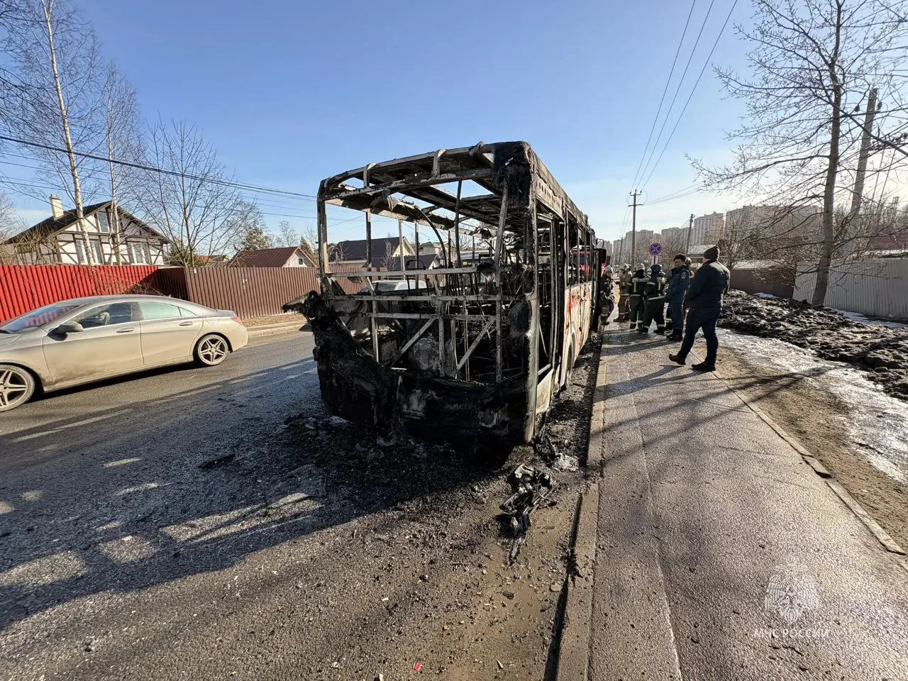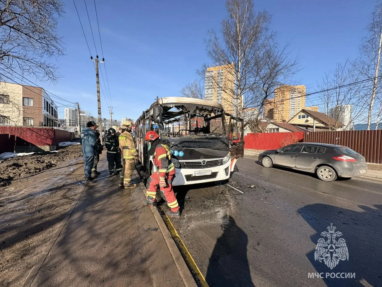 По прибытии огнеборцы установили, что рейсовый автобус маршрута №563 (станция метро Девяткино — Лаврики-1) сгорел изнутри по всей площади. Благодаря оперативным действиям водителя огонь удалось потушить до приезда основных сил МЧС.