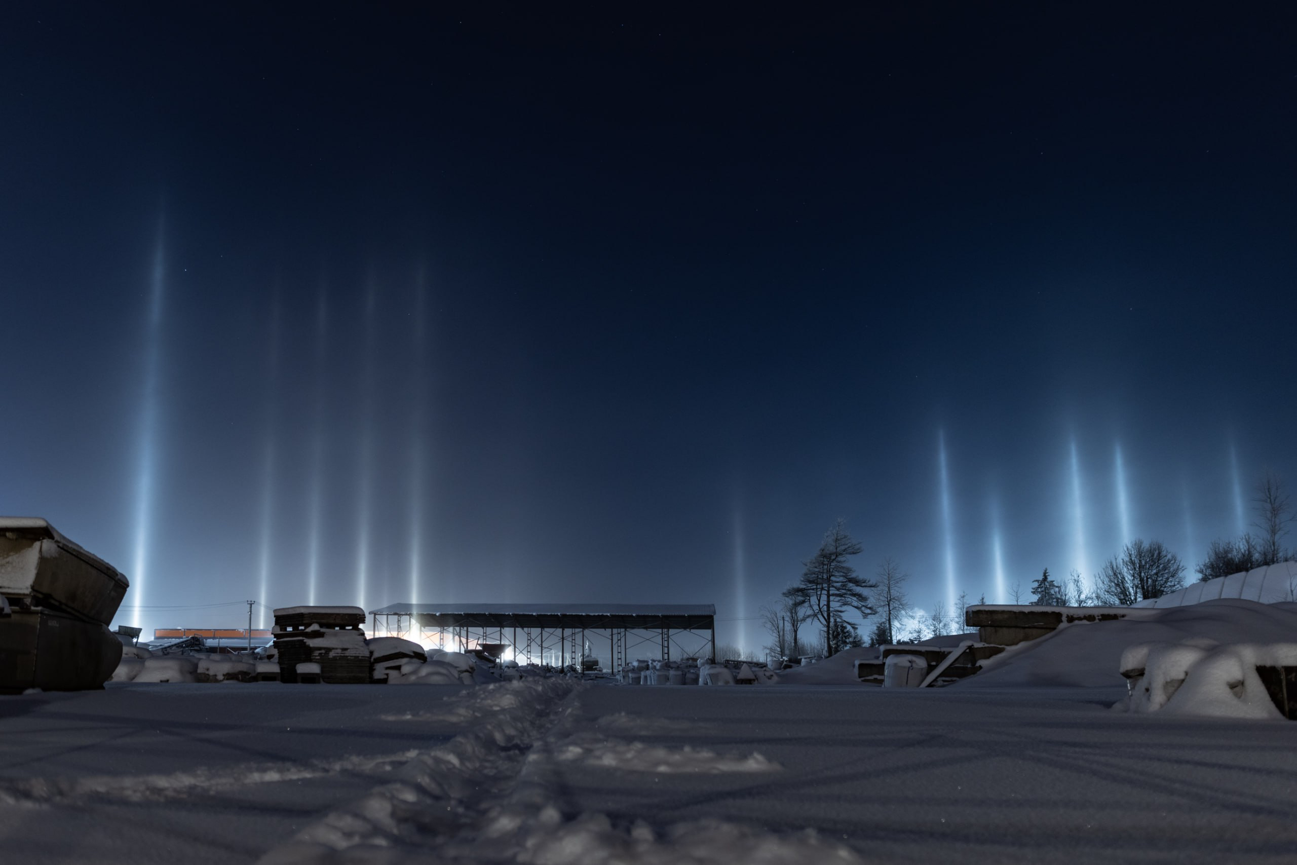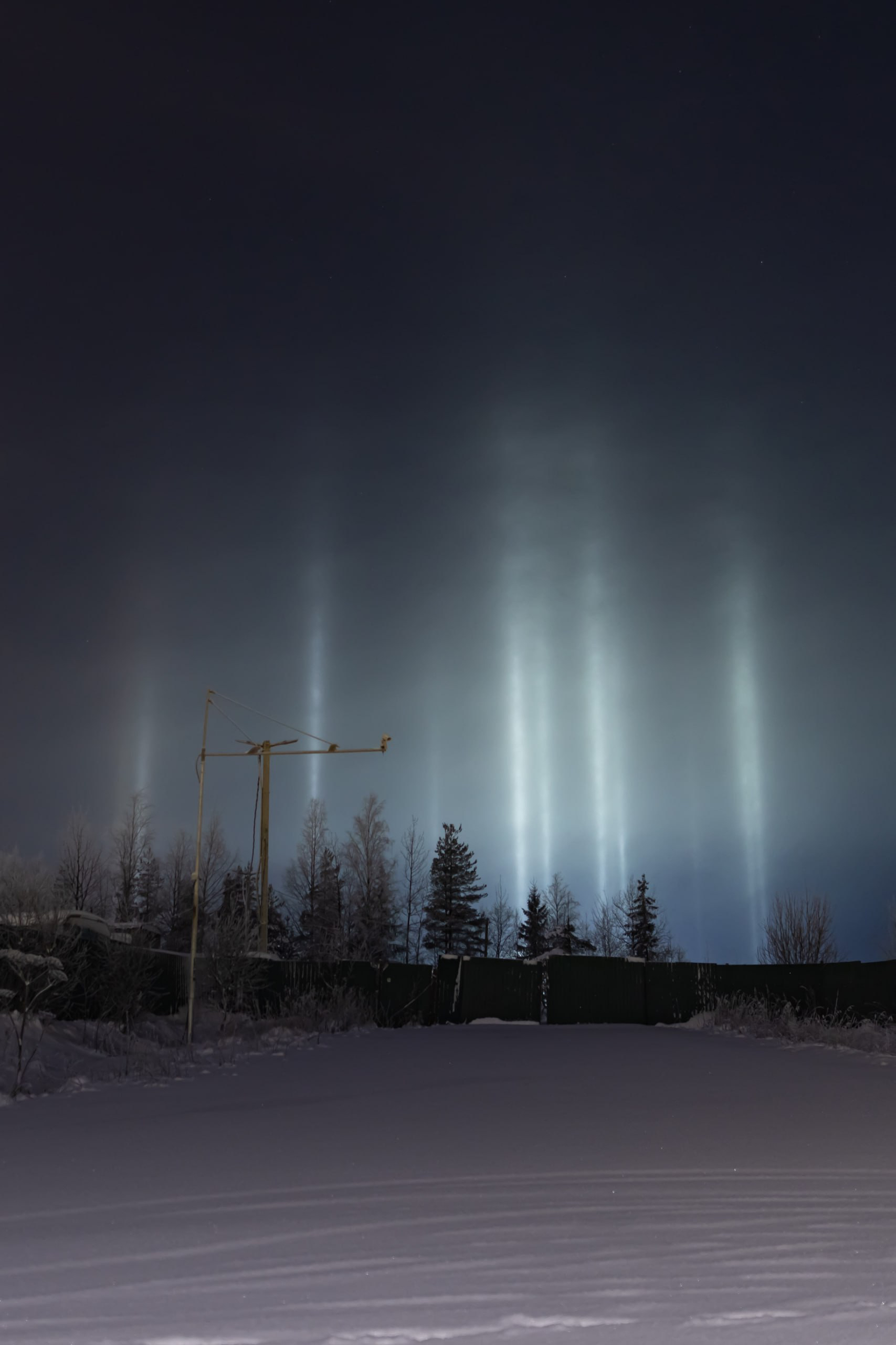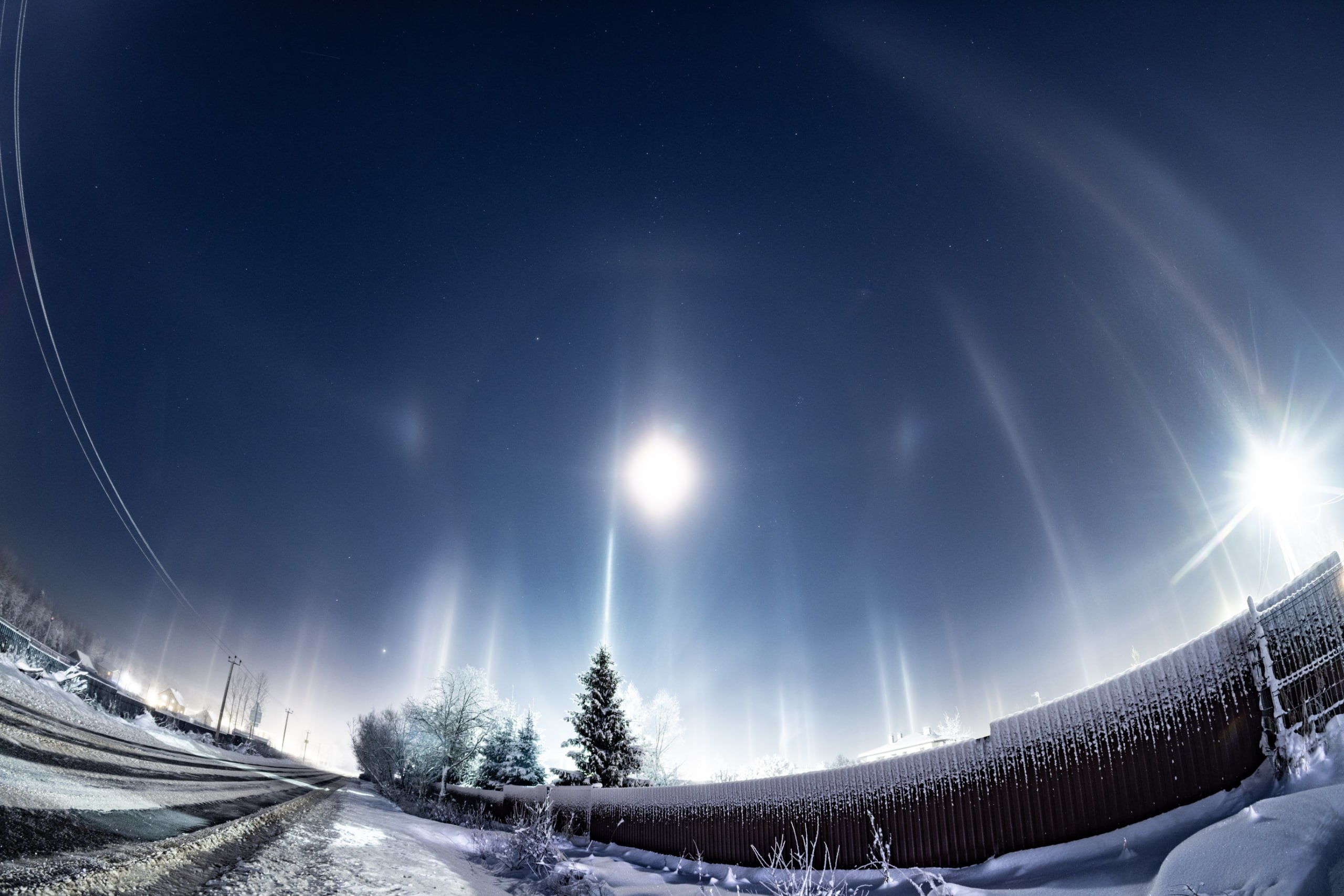 В четверг, 1 января, жители Всеволожского района Ленинградской области наблюдали впечатляющее атмосферное явления - световые столбы. Им также удалось увидеть лунное гало с парселенами и параселенный круг.