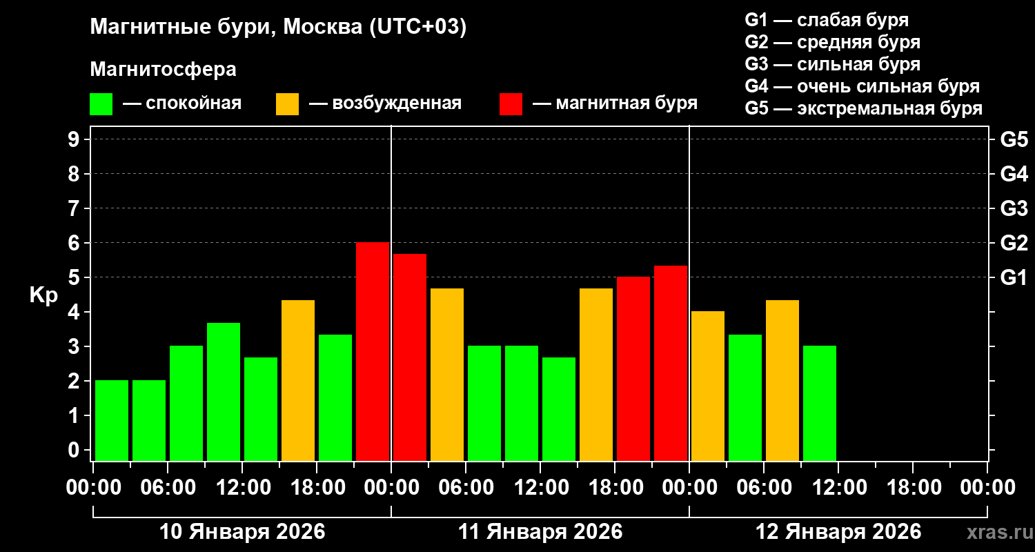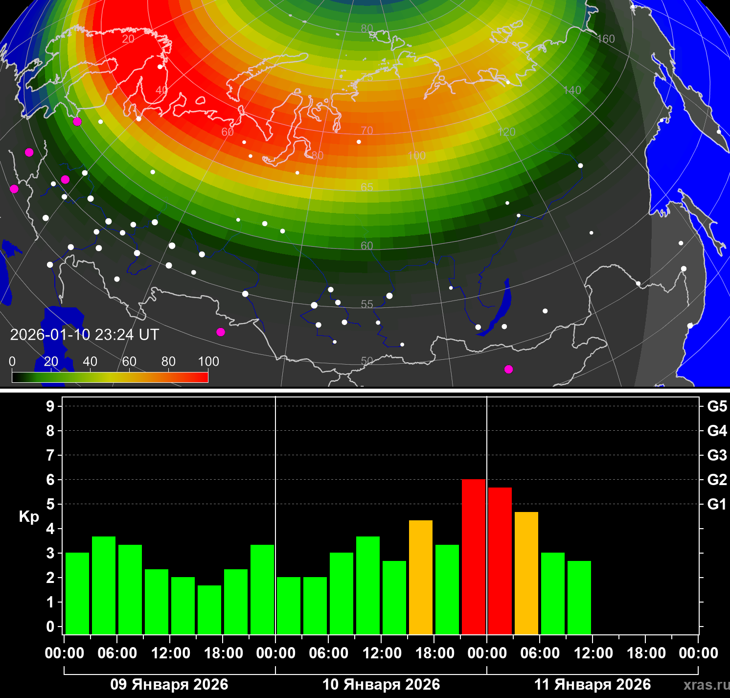 В ночь на воскресенье, 11 января, около полуночи по московскому времени Землю накрыла вторая с начала года магнитная буря. Она была вызвана приходом к Земле облака плазмы, выброшенного во время одной из недавних слабых солнечных вспышек. Поток достиг планеты раньше прогноза и оказался намного мощнее ожидаемого, отмечает Лаборатория солнечной астрономии (ИКИ РАН и ИСЗФ СО РАН).
