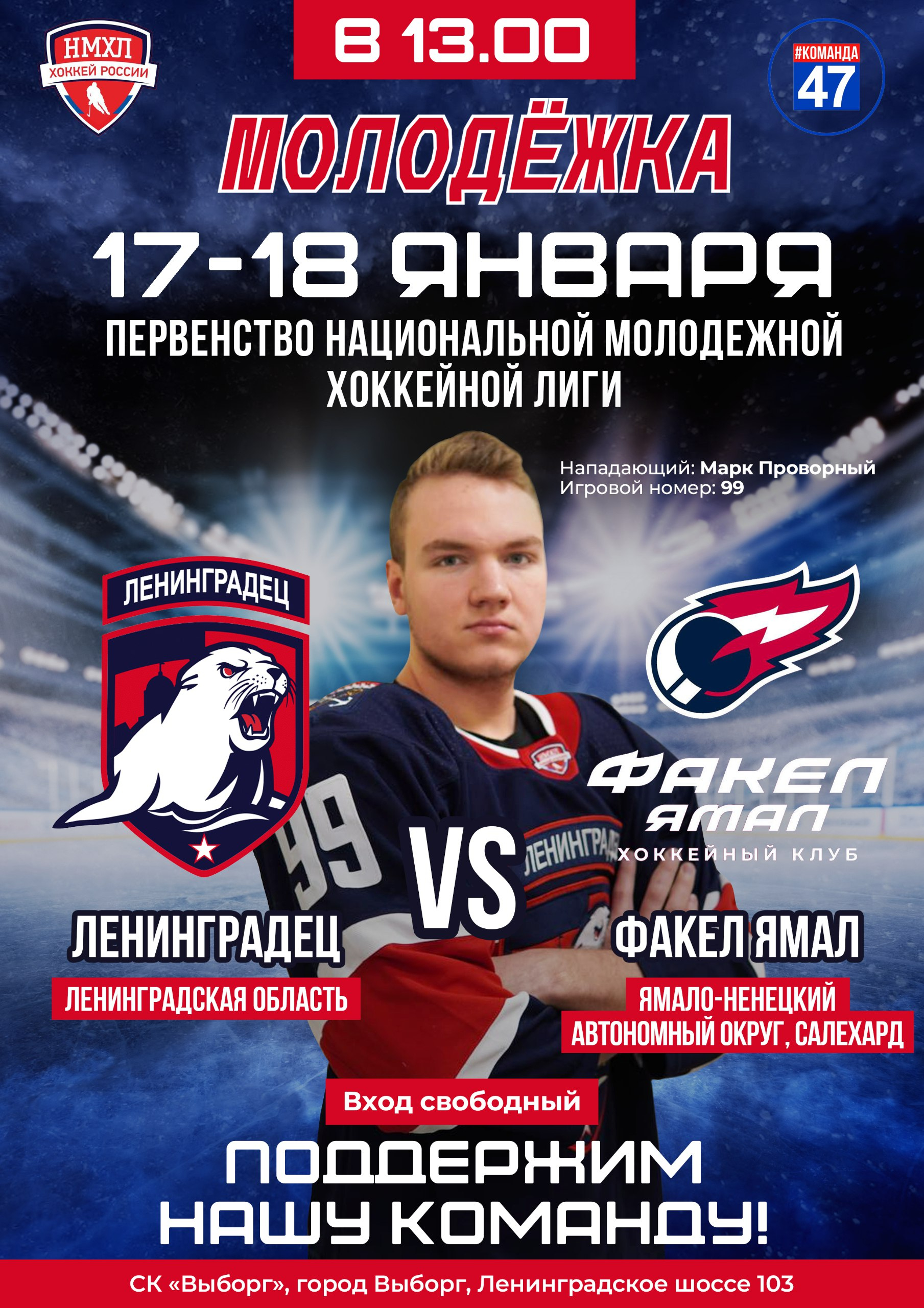 ХК "Ленинградец" проведет домашние матчи против команды "Факел Ямал" в рамках Национальной молодежной хоккейной лиги (НМХЛ) в Выборге 17 и 18 января. Встречи пройдут в комплексе "Выборг" (Ленинградское шоссе, 103).
