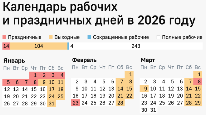 При этом общий баланс дней в году не изменится. В 2026 году будет 247 рабочих и 118 выходных и праздничных дней, как и в 2025-м. Зато из-за длинных новогодних каникул майские праздники окажутся короче: отдыхать будем с 1 по 3 и с 9 по 11 мая.