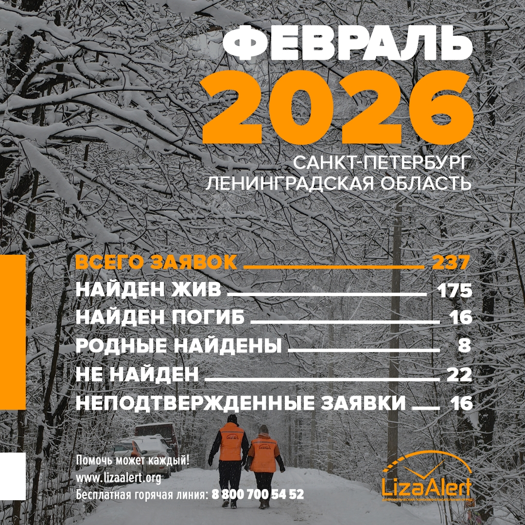 В феврале 2026 года отряд «ЛизаАлерт» получил 237 заявок о пропажах людей в Санкт-Петербурге и Ленинградской области. Поиски 175 человек успешно завершились, еще 16 операций закончились трагически.