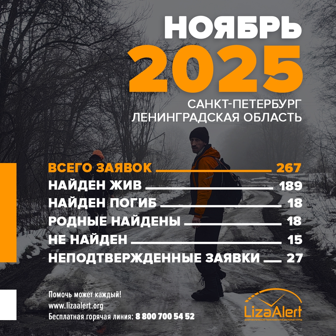 В ноябре 2025 года волонтеры из отряда «ЛизаАлерт» получили 267 заявок о людях, пропавших в Санкт-Петербурге и Ленинградской области. 189 поисков закончились успешно, еще 18 - трагически.