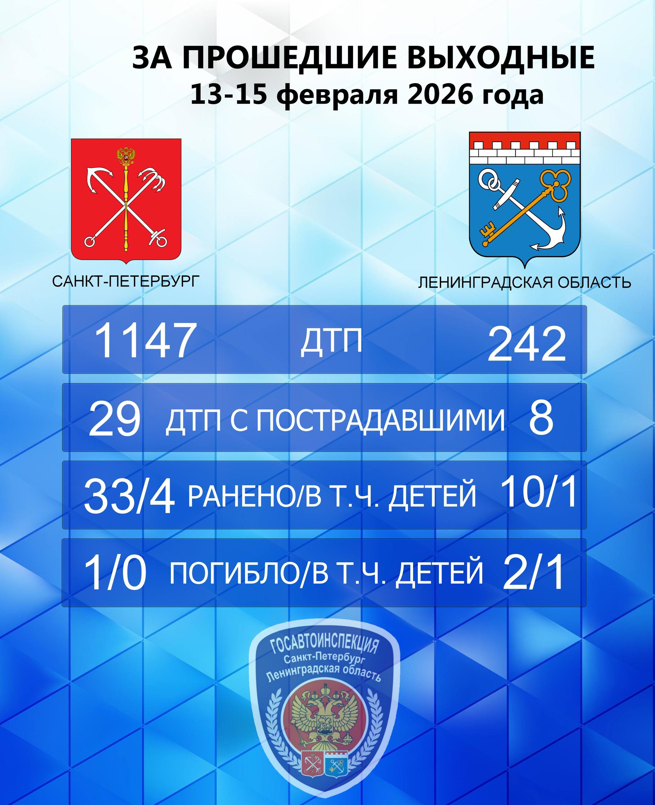 В период с 13 по 15 февраля 2026 года в Санкт-Петербурге, в свою очередь, произошли 1 147 аварий. В них пострадали 33 человека, в том числе - четверо детей. Один человек погиб.