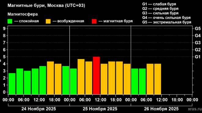 Геомагнитная активность усилила полярные сияния: индекс дважды превысил максимальное значение 10, но всплески пришлись в дневное время. При высоких скоростях солнечного ветра магнитосфера реагирует даже на небольшие изменения потока плазмы, поэтому всплески сияний, вероятно, будут повторяться. Отслеживать их сложно из-за облачности, но отдельные снимки поступают из северных и северо-западных регионов.