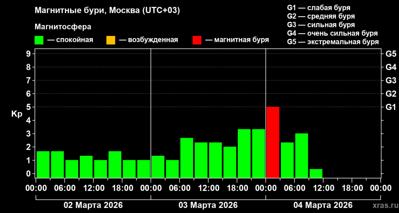 В ночь на среду, 4 марта, зафиксирована слабая магнитная буря. Между полуночью и 3 часами по московскому времени специалисты зарегистрировали короткое геомагнитное возмущение уровня G1, которое, по наблюдениям специалистов, возникло из-за внутренних процессов в хвосте магнитосферы, а не внешних воздействий.