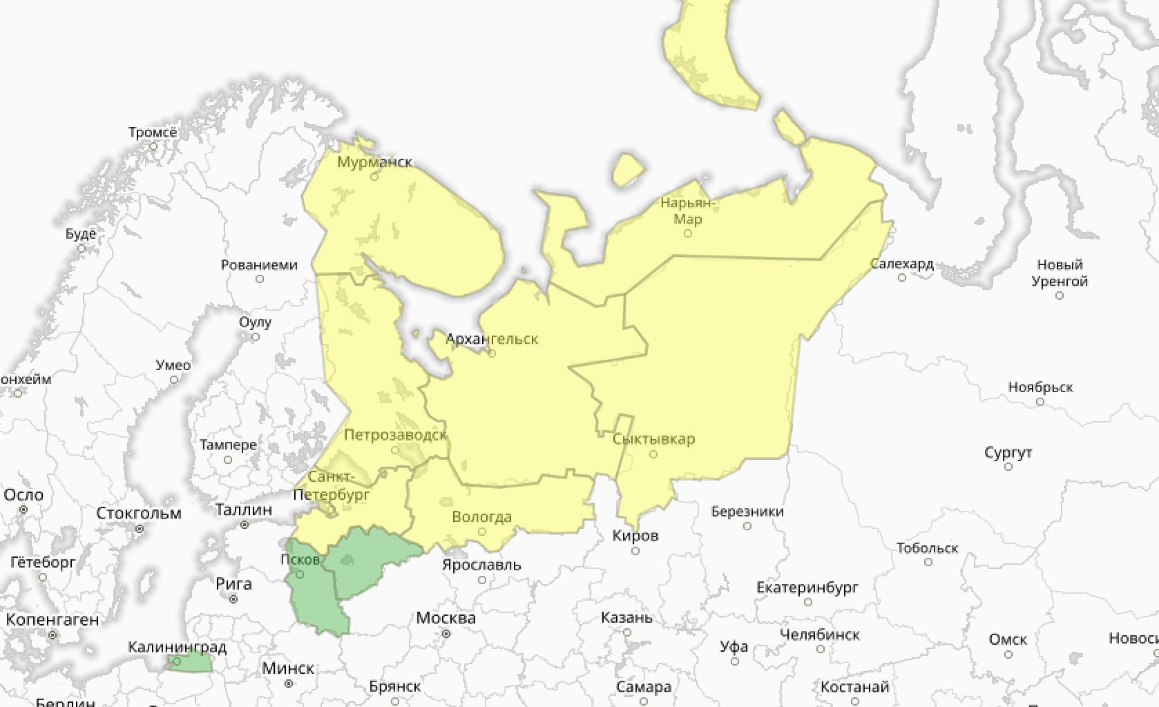 Желтый уровень опасности также введен в Санкт-Петербурге. В ночь на 24 января в Северной столице также ожидается очень низкая температура воздуха - до -20 градусов. Петербуржцев также предупреждают о неблагоприятных метеоусловиях.