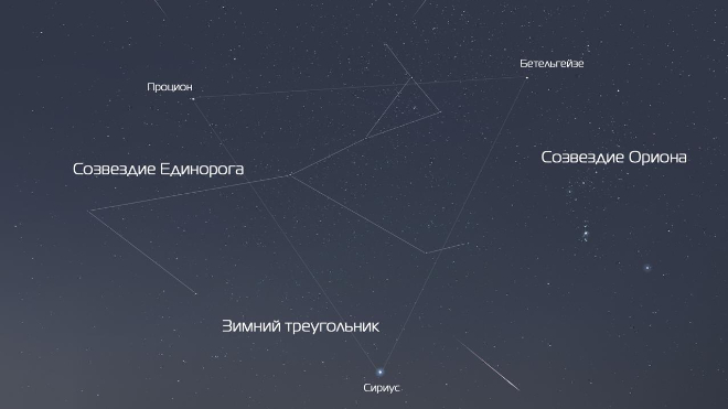 Вершины Зимнего треугольника — три самые яркие звезды декабрьского небо. Это Сириус, Процион и Бетельгейзе. Внутри фигуры скрывается еще одно созвездие, которое люди, даже при длительном наблюдении, не замечают. Речь идет о созвездии Единорога.